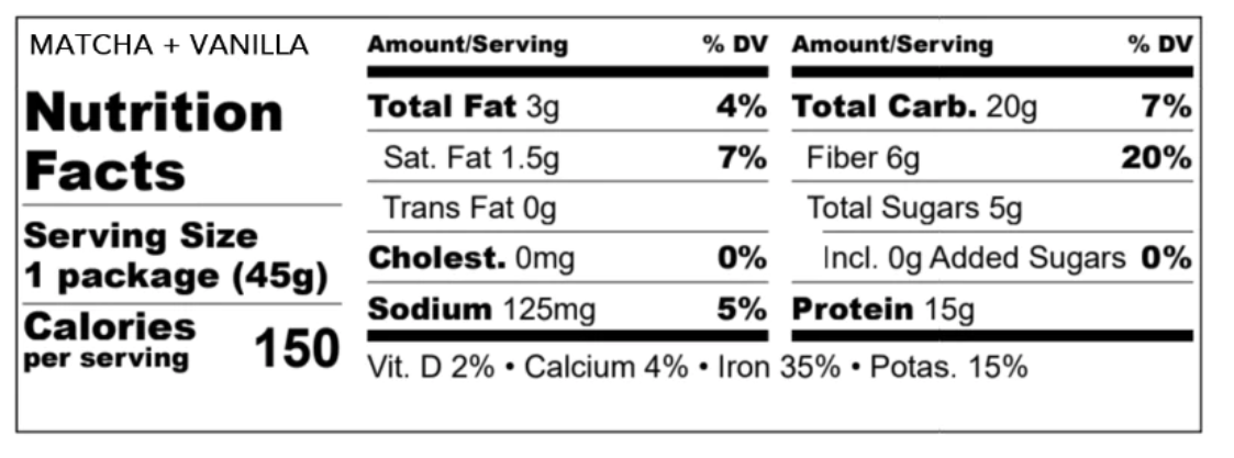 Ingredients: Pumpkin Seed Protein*, Gelatinized Maca*, Banana Powder*, Tocotrienols*, Coconut Milk*, Ginger*, Psyllium Husk*, Vanilla Powder*, Ceremonial Matcha*, Wheatgrass*, Ashwagandha*, Spirulina*, Enzyme Blend [Amylase, Protease, Peptidase, Papain, Lactase, Lipase], Pink Himalayan Salt, Locust Bean Gum*, Xanthan Gum, Probiotic Blend [Lactobacillus Acidophilus, Lactobacillus Plantarum, Lactobacillus Salivarius, Bifidobacterium Breve, Bifidobacterium Lactis], Stevia Reb-A*, Monkfruit (Luo Han Guo)* *Certified Organic