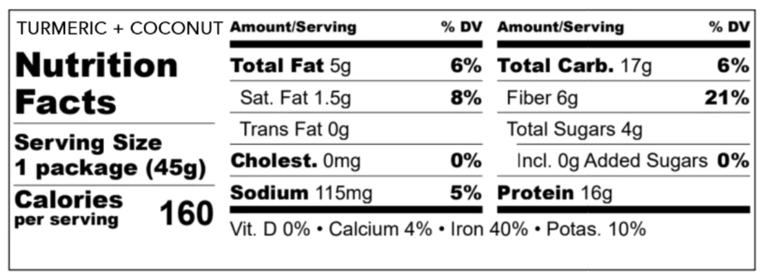 Ingredients: Pumpkin Seed Protein*, Gelatinized Maca*, Tocotrienols*, Brown Flax Seeds*, Banana Powder*, Coconut Milk*, Turmeric*, Ginger*, Ceylon Cinnamon*, Turmeric Extract Powder (Curcumin)*, Enzyme Blend [Amaylase, Protease, Peptidase, Papain, Lactase, Lipase], Pink Himalayan Salt, Locust Bean Gum*, Xanthan Gum, Probiotic Blend [Lactobacillus Acidophilus, Lactobacillus Plantarum, Lactobacillus Salivarius, Bifidobacterium Breve, Bifidobacterium Lactis], Stevia Reb-A*, Monkfruit (Luo Han Guo)* *Certified Organic